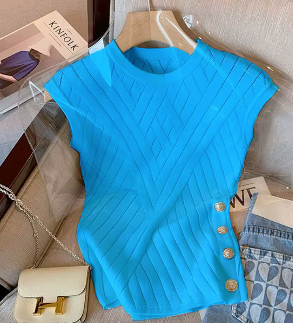 Designed with a textured geometric pattern and elegant side gold-tone buttons, it combines modern style with effortless comfort. The cap-sleeve cut and round neckline create a flattering silhouette