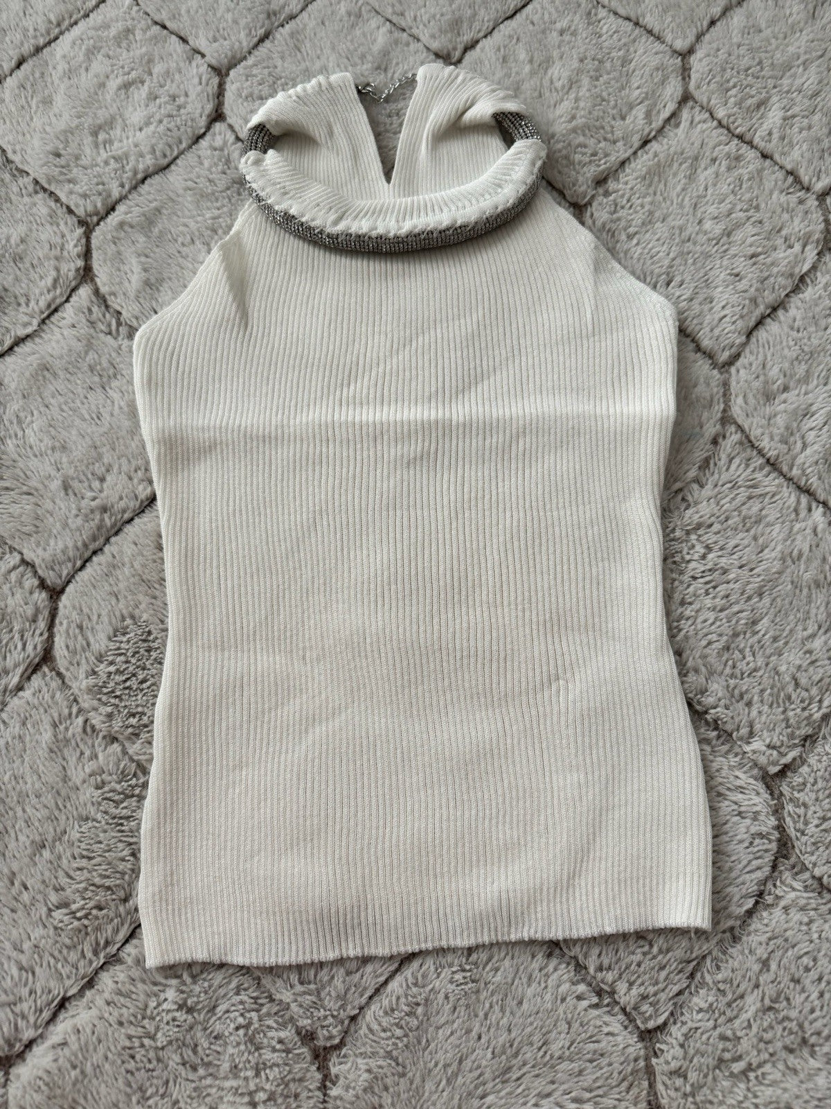 Elegance meets modern style in this stunning sleeveless top. Made from a soft, ribbed stretch fabric, it fits comfortably while flattering your silhouette. The standout feature is its high neckline adorned with a metallic, rhinestone-style chain — adding a sophisticated and glamorous touch.